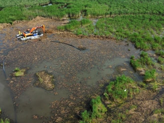 Díky výkonné technice a 3D nivelačnímu systému zvládl bagrování, likvidaci vegetace i odsávání sedimentu v neúnosném terénu